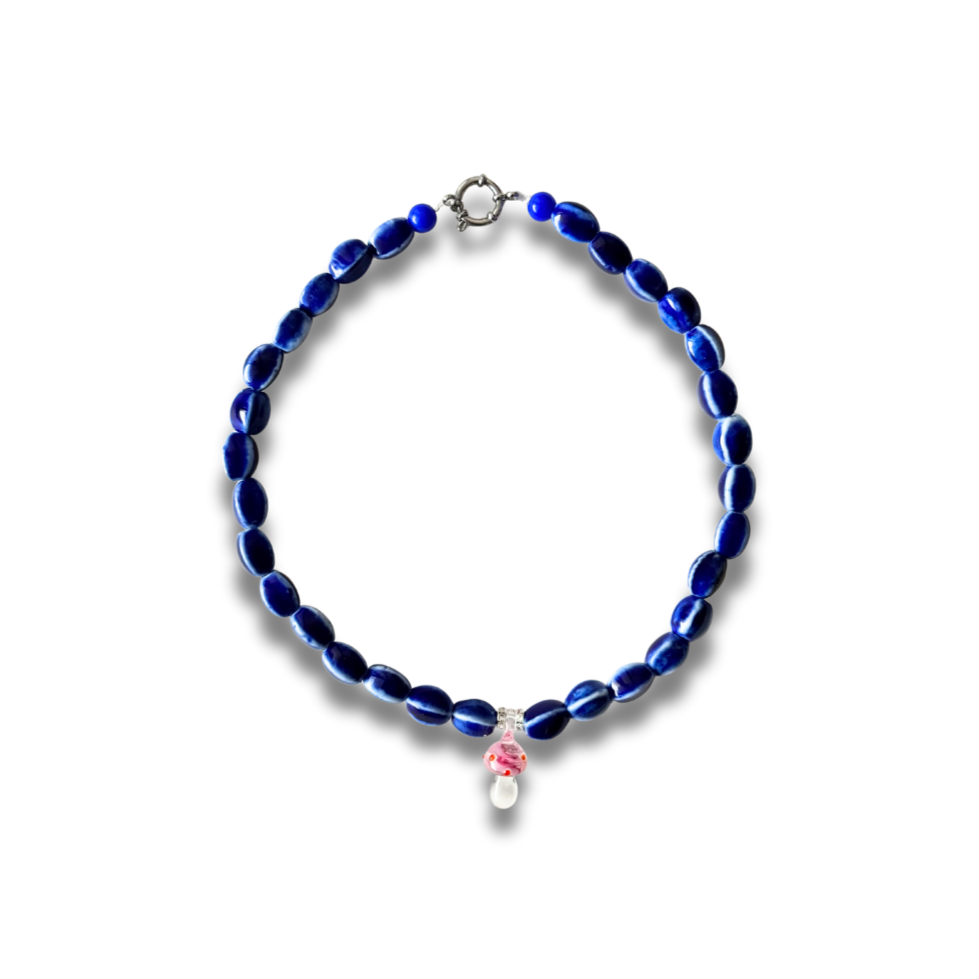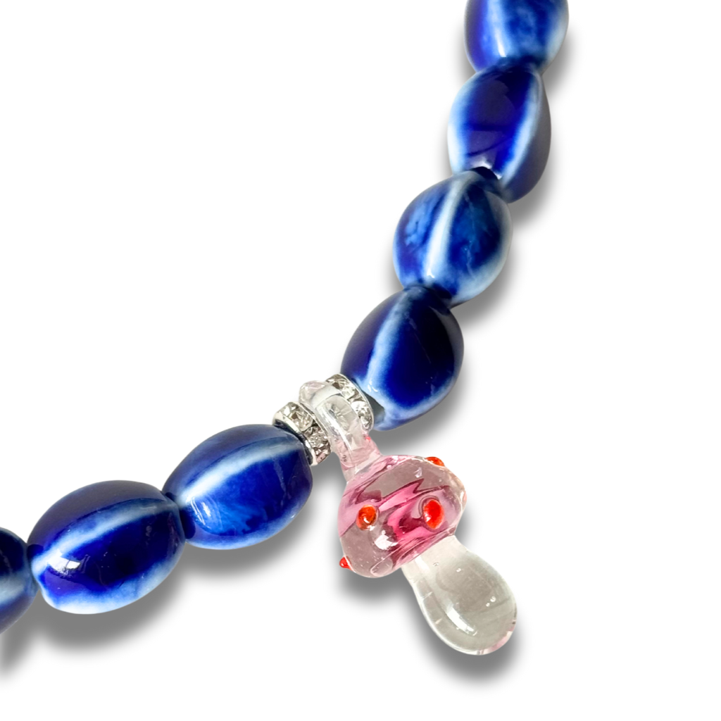 Un collar con magia, color y un toque piscodélico. Mushi combina con beads azul profundo con un charm de hongo rosa de cristal de murano que parece sacado de un cuento, pero uno donde tú eres el protagonista.
