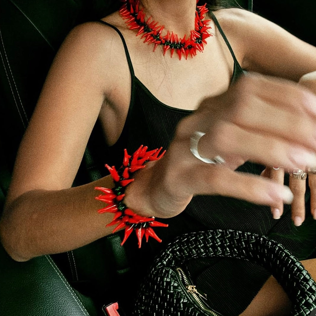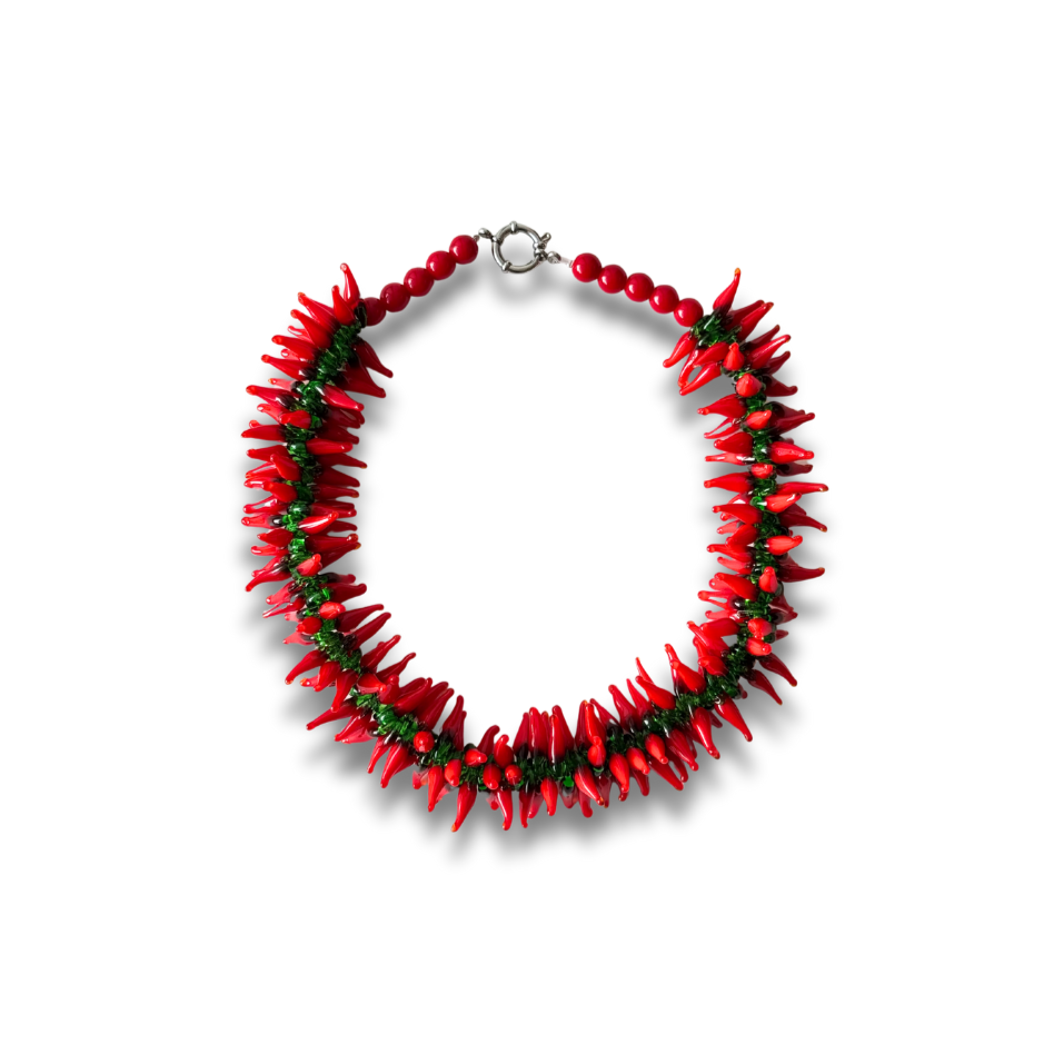 Este choker no es accesorio, es advertencia. Salsa brava esta confeccionado 100% a mano con cristal de Murano, combinado beads rojos intensos con una cascada de pequeños chiles en vidrio que parecen cosechados...pero en versión joya.