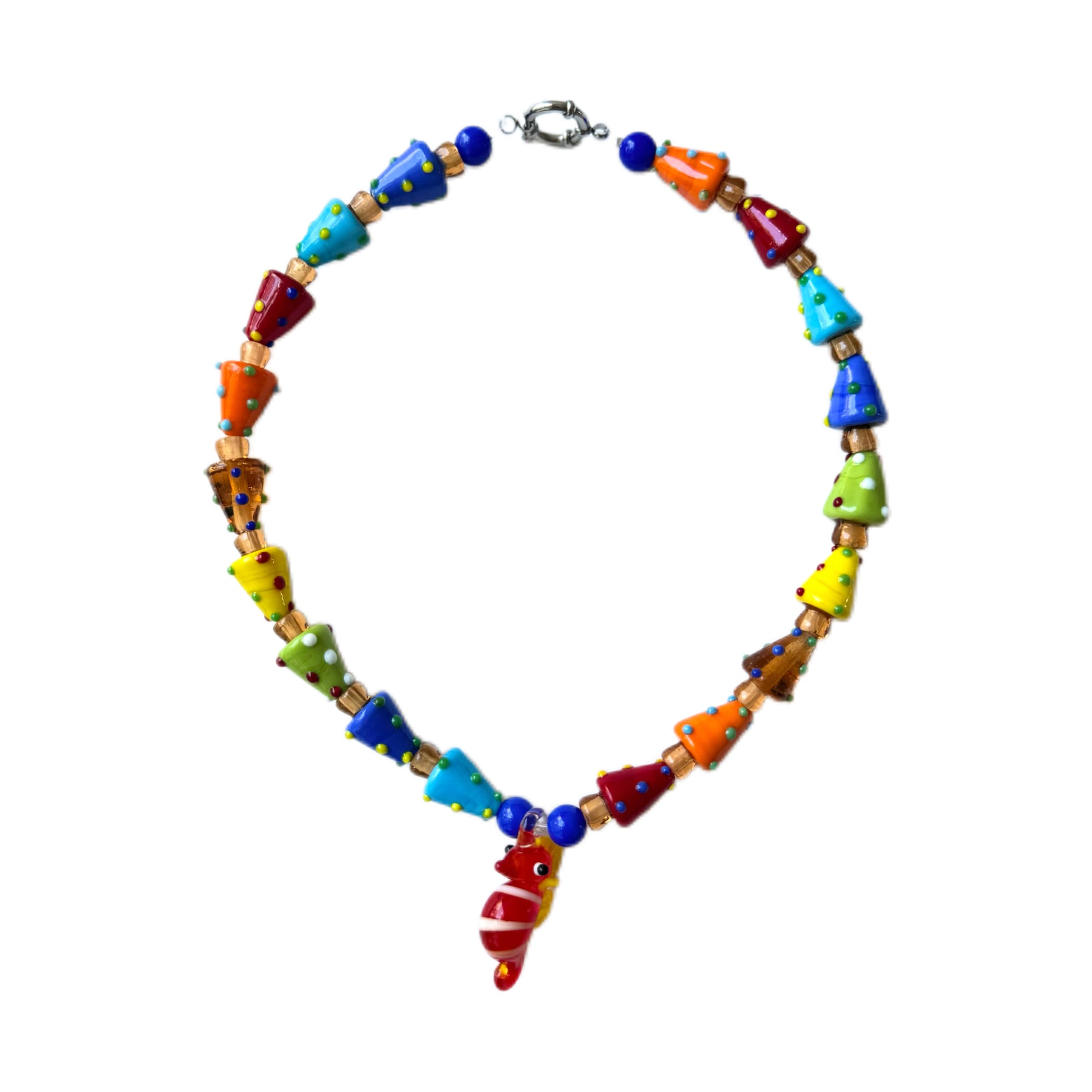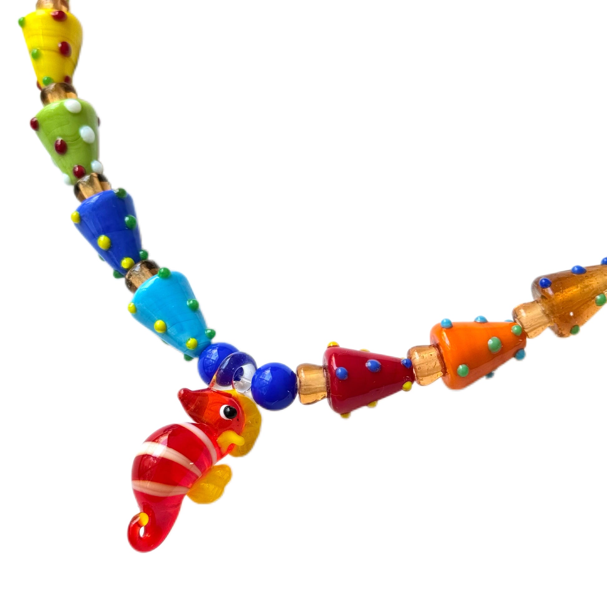 Para las que crecieron soñando con tener una sirena como mejor amiga. Este collar tiene toda la magia marina con un caballito de mar como charm central, rodeado de cuentas color caramelo que parecen sacadas de una feria.