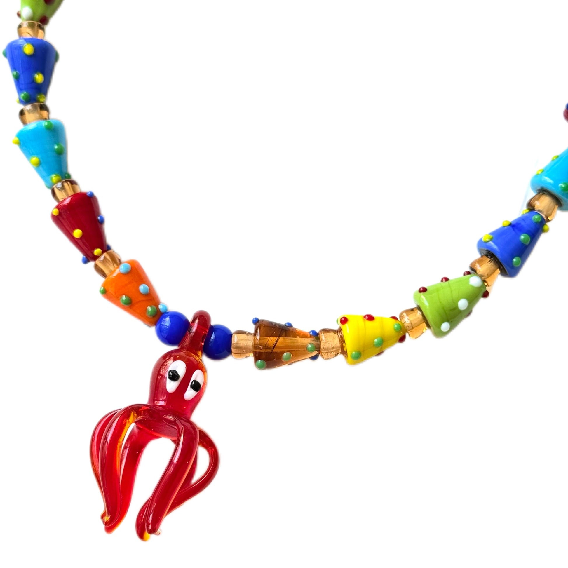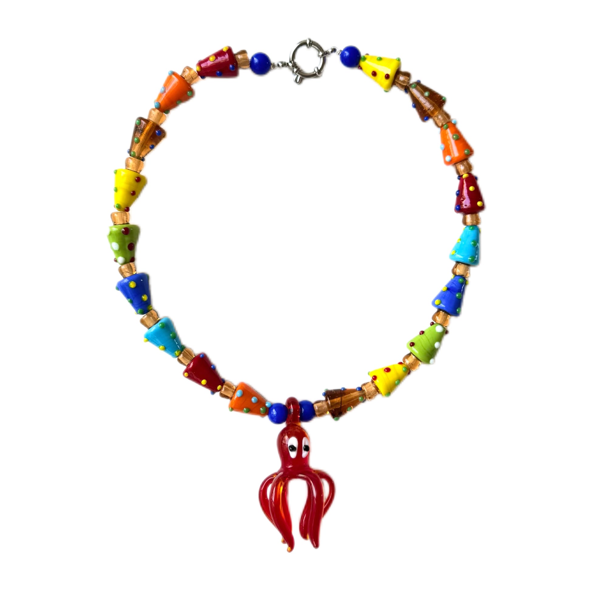 Un pop de color, una vibra de verano eterno y un pulpo que parece sacado de una caricatura que amabas de niña. Este collar está hecho con cuentas de vidrio en forma de mini conos de helado, colores que te hacen feliz y un charm de pulpo blown-glass que es simplemente icónico.